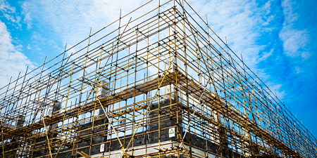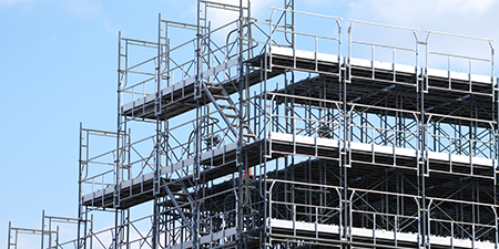 足場工事とは、建築現場など高所で作業をする際に、足元を支える足場の工事のこと。