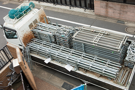 足場工事とは、建築現場など高所で作業をする際に、足元を支える足場の工事のこと。